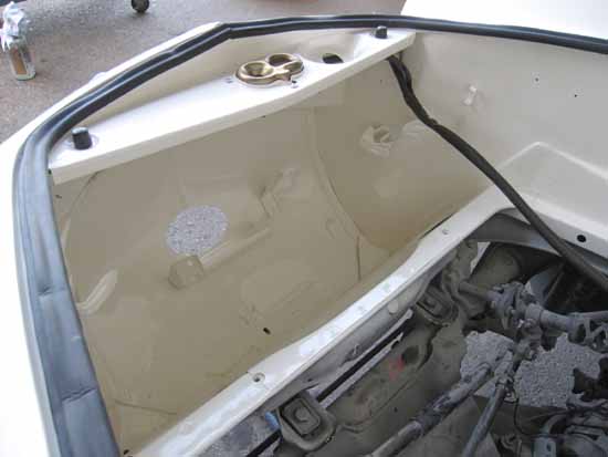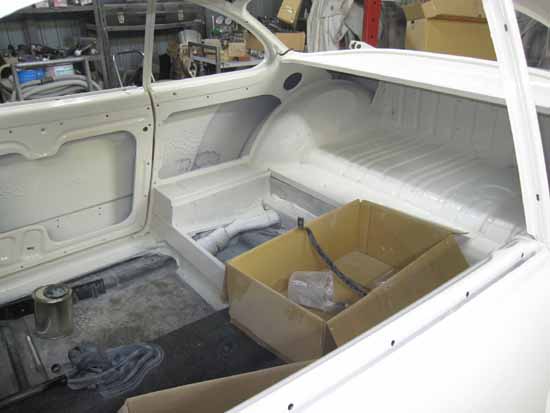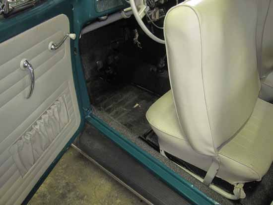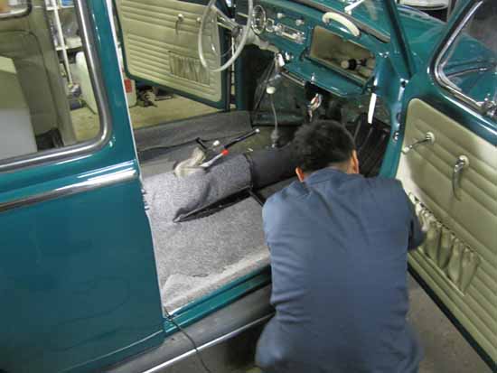 写真右は防錆処理のため一度剥がしたカーペットを張り込んでいるところです。