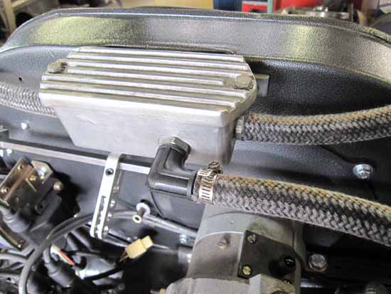ブリーザーBOXのホースは90度のエルボーを使い、取り付け角度を無理なくしてみました。