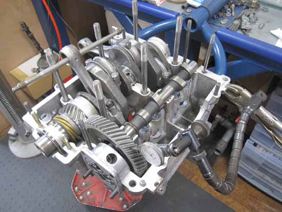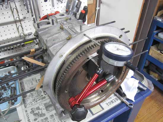 ケースにクランク&カムシャフトを組んでギアの当たり&バックラッシュの点検を行います。