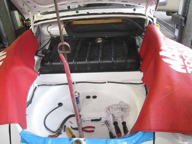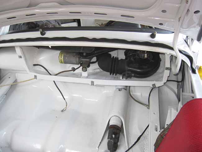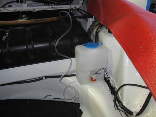 フロントフード内には電動ウォッシャータンクを取り付けました。