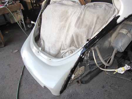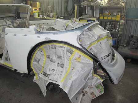 リアエプロンから左右クォーターパネルの下処理を行っています。