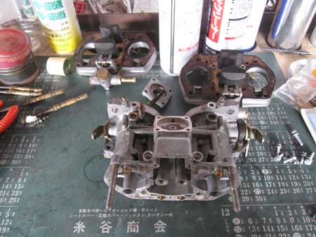 フロント足回りの調整も午後に行い、キャブレタージェッティングの真っ最中です。
