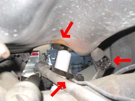 そしてその隣の赤矢印は、フューエルホースの漏れです・・・タンク下で滲みが発生していました。