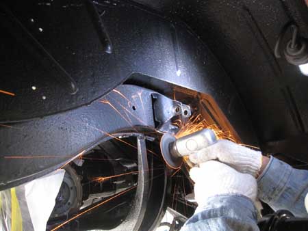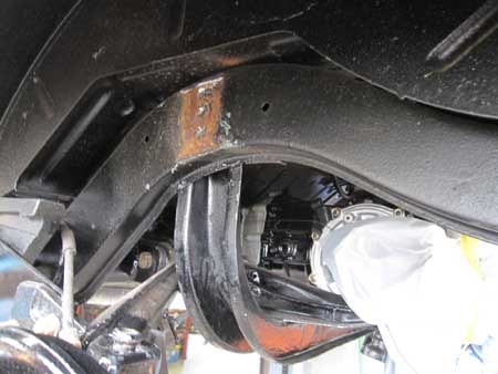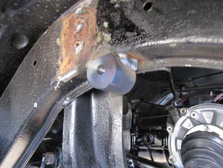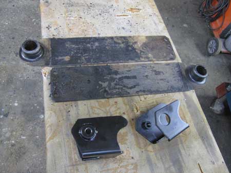 写真左が製作したショックマウントをボディーに溶接したところです。