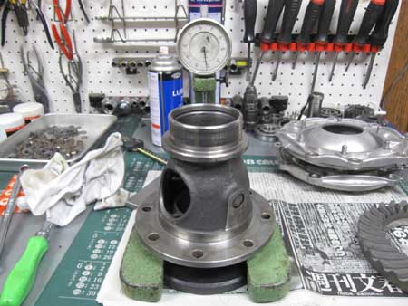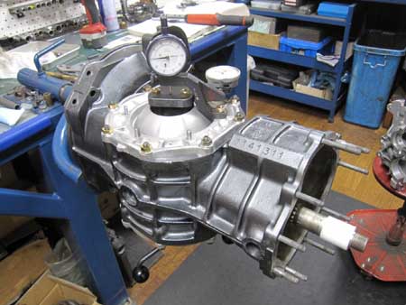 写真中央はデフキャリアのハイトを測定しているところで、写真右はケース内の測定です。