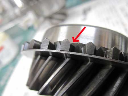 写真左はメインシャフト側の3rdギアですが、スライダーハブのギア(赤矢印部)にはまったく磨耗が出ていません!
