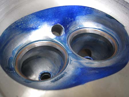バルブシートカット後にフェースとの当たりを見ると・・・???ナンか変なところに当たっています。(写真左)