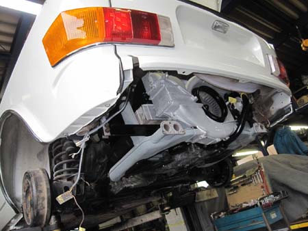 マフラーはすんなり取り付けできましたが、やはりリアエプロンはガッチリ干渉してしまいました・・・。