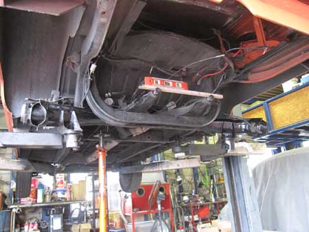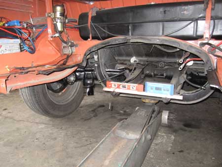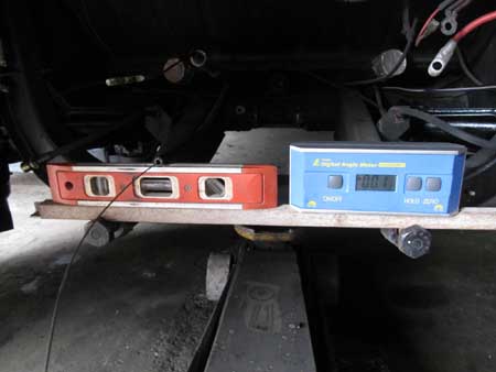 フレームホーンで水平をとり、キャンバー角、トー角、ホイールベースを再確認。