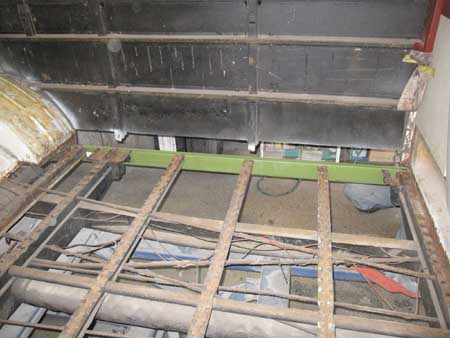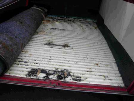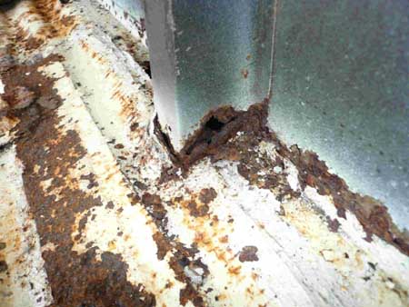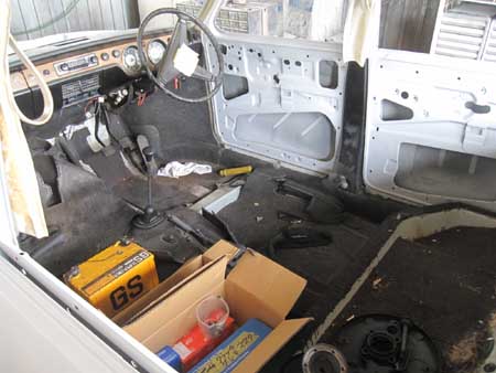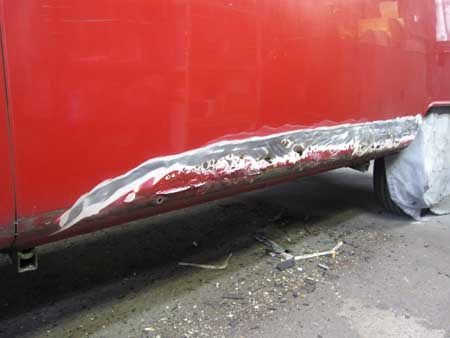 それがこの写真で、フロアーにはいたるところにサビ穴が開き、左サイドパネルにもサビが進行している様子・・・。