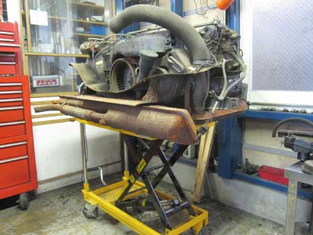 T−4のエンジンは大変重たく、コレ用にエンジンスタンドを買ってはあるのですが、なんだか使いづらくていつもの場所で行っています。