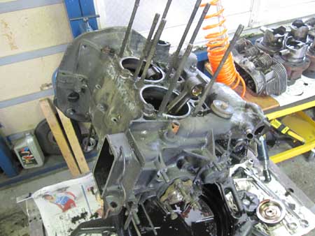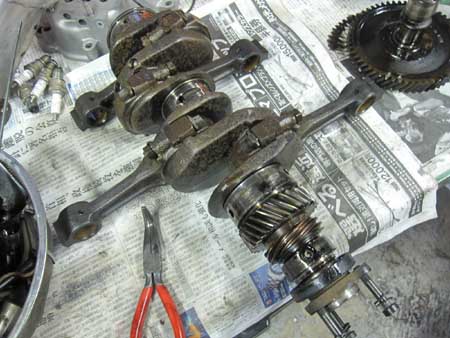 ロッカー、シリンダーヘッド、ピストン&シリンダーを分解してケースもパカッ♪と割ると、クランクシャフト&カムシャフトがコンニチワ〜〜!!