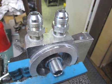 青いブロックの正体は・・・大阪のジェフリーズ様で販売しているオイルクーラー用のアダプターでした。