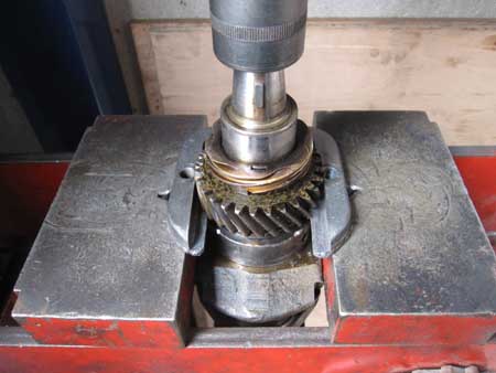 クランクシャフトのタイミングギアを外そうとしたのですが・・・T−1系のギアプーラーは使えない・・・。