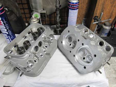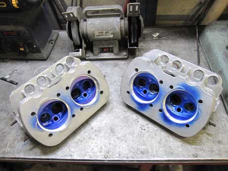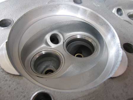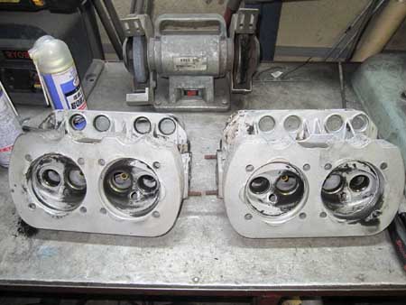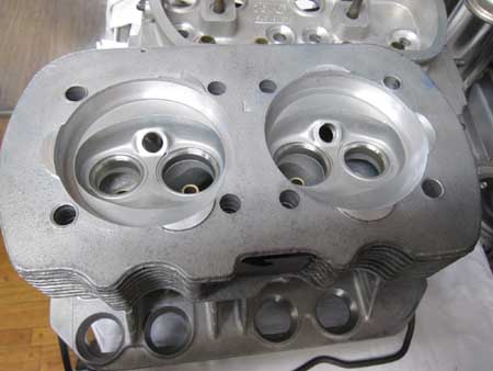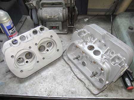 写真左はバルブシートカット&すり合わせが完了した燃焼室です。