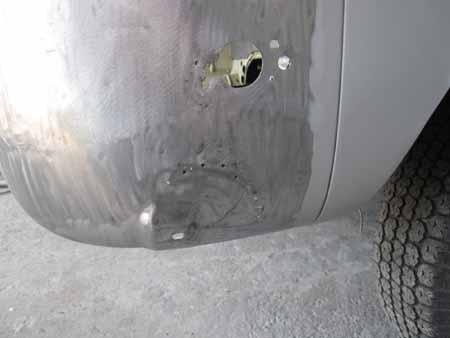続いて右リアコーナーパネルの剥離をしてみると・・・ここにも“マシンガン攻撃”が・・・。