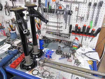 これからフォークジグをセットして各部動きのチェック&フォーク調整を行います。