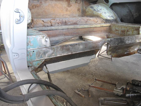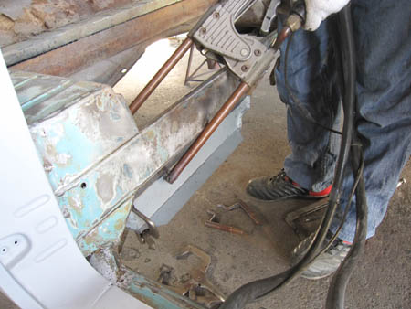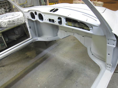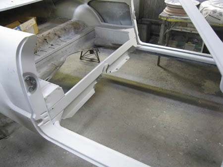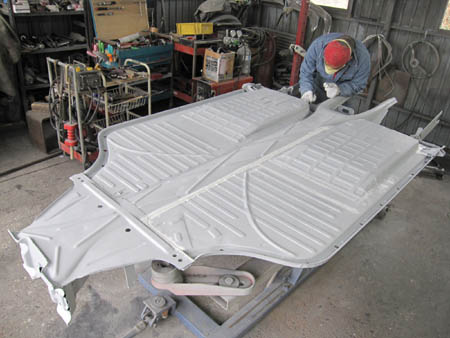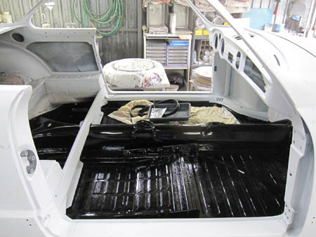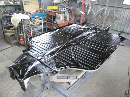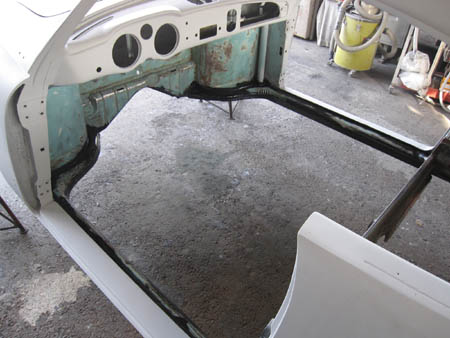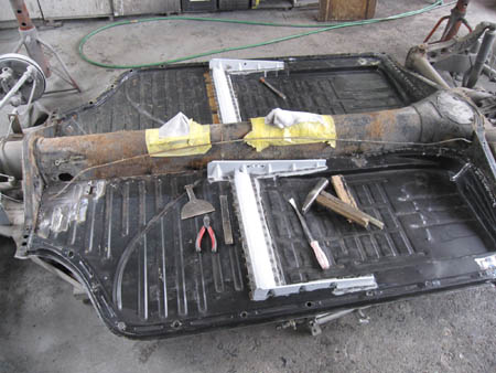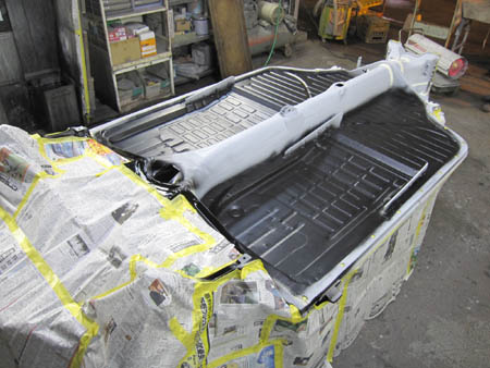 剥離したフロアーにサフェーサーを入れ、フロアーパンの溶接部分にボディーシーラーを充填します。