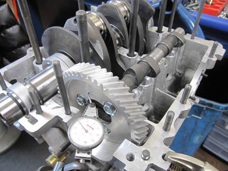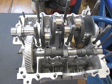 クランクシャフト&カムシャフトをケースにセットして仮組みします。
