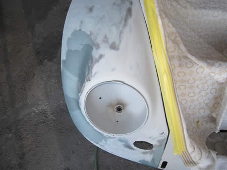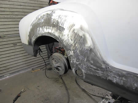 剥離が完了したリアフードには仮サフェを入れ、続いて右リアクォーターパネルの張り替えを開始いたしました。