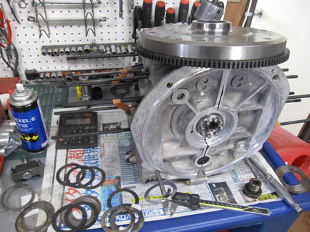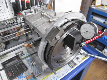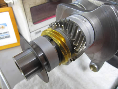 組み上がったクランクシャフトをケースにセットして、カムを組み込みバックラッシュの点検を行いました。