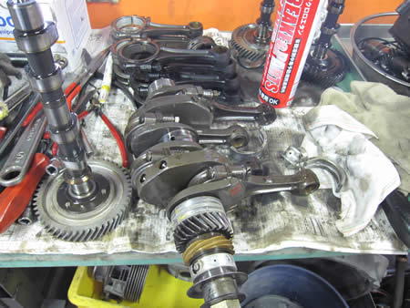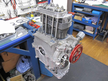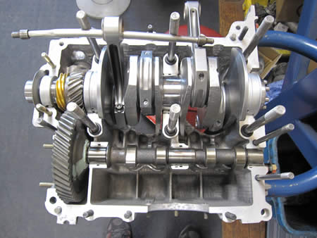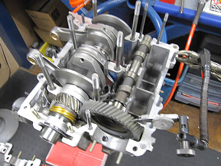 続いてクランク&カムを組み込み、ショートブロック一歩手前まで進んでいます。