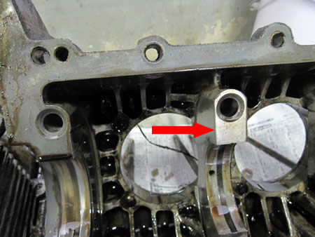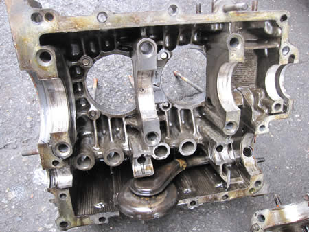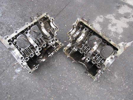 先ずは写真左から、クランクケースのセンタージャーナル(矢印部)に歪みが出ています。