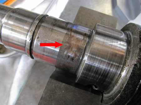 次はクランクシャフト、写真中央の矢印部分にはタイミングギアが圧入されているのですが、赤黒く変色しているでしょ?