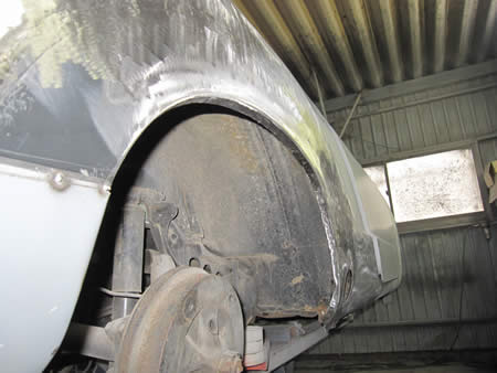 続いて左リアクォーターパネルの切開&防錆処理を行っています。