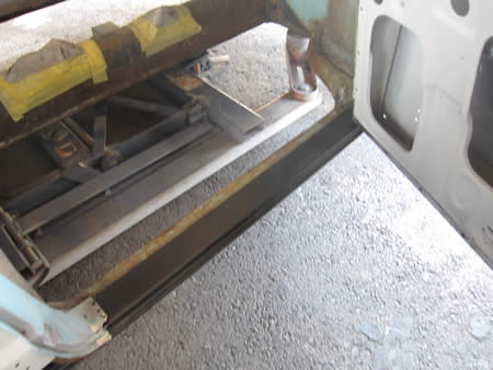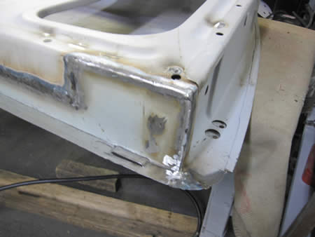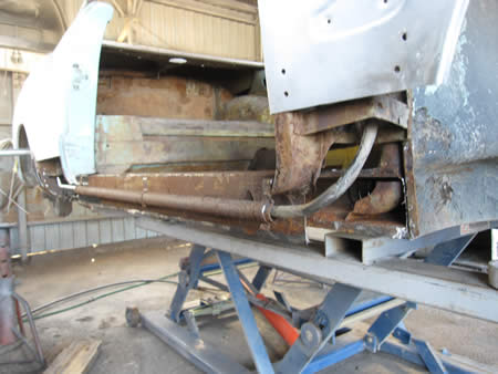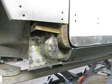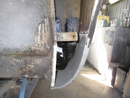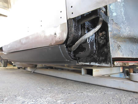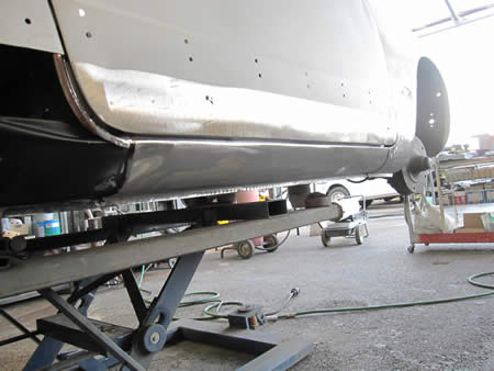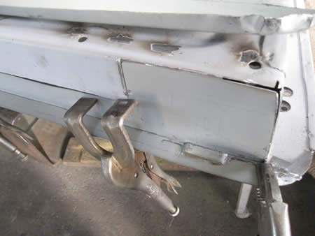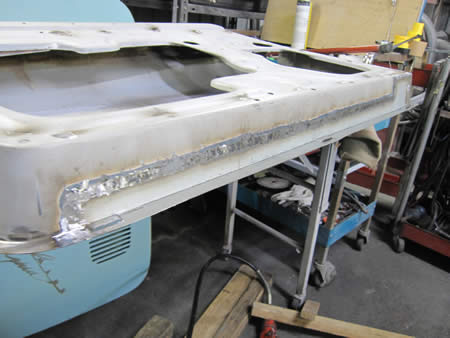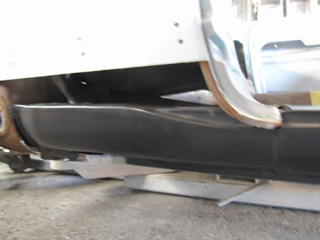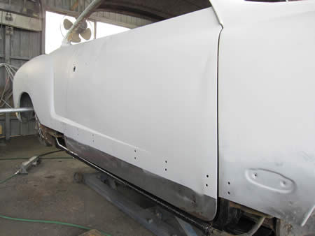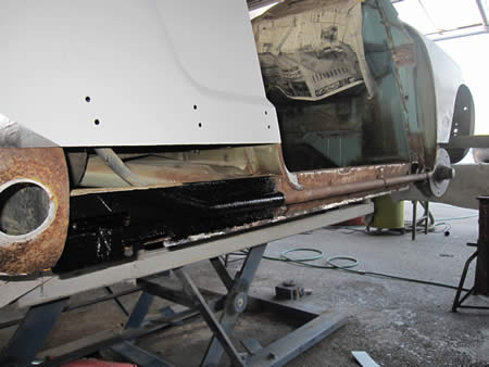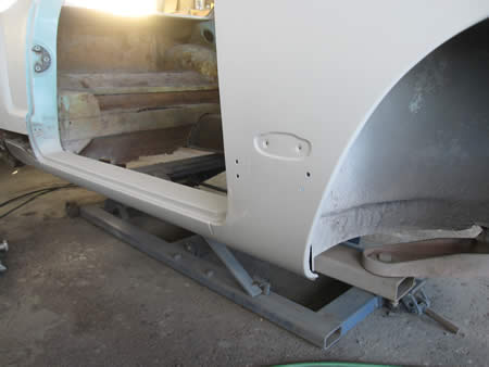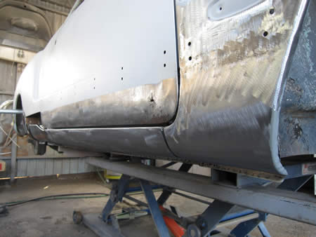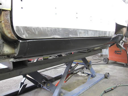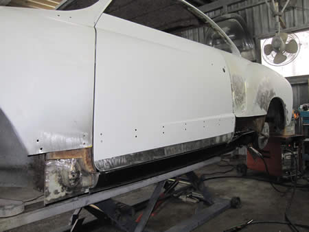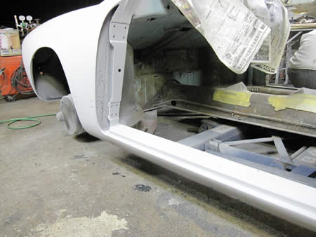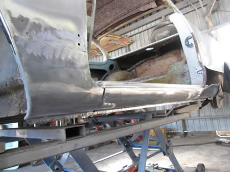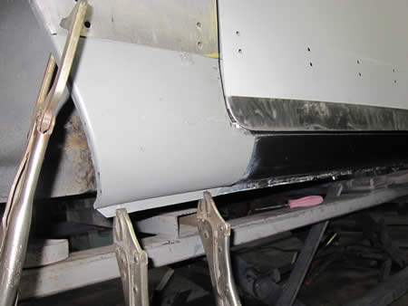フロント側のインナーパネルの張り替えが完了し、ロッカーパネルの仮付けを行っています。