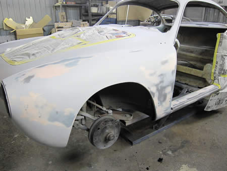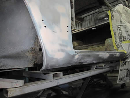 左フロントフェンダー&サイドメンバーの面修正が完了してサフェーサーが入りました!