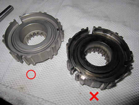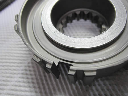 洗浄したミッションの部品を点検すると・・・1−2速のスライダーハブにバリが出ています・・・。