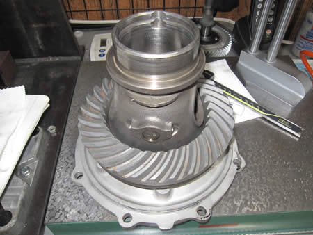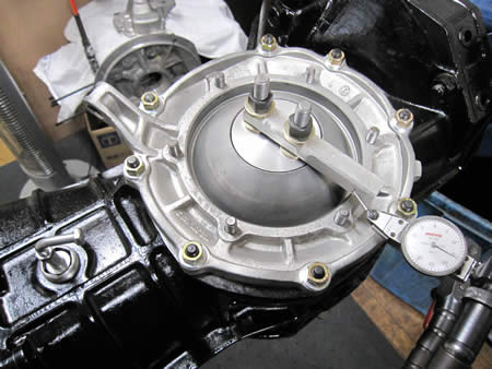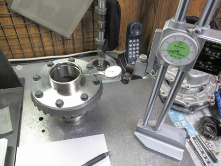 メイン&ピニオンシャフトを組み上げ、フォークジグに掛けて最終調整を行っています。