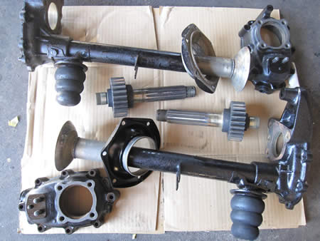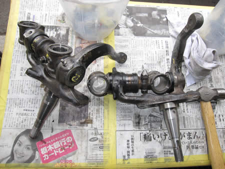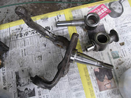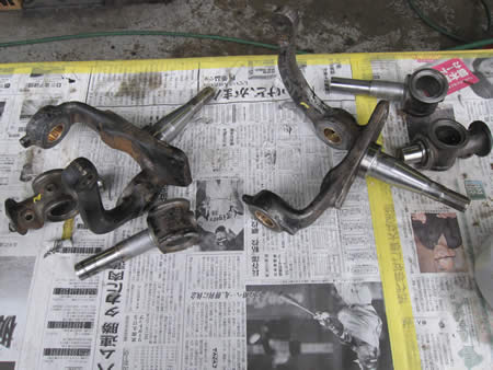 分解バラバラにしたパーツを先ずは洗浄し、キングピンブッシュの入れ替えを行っているところです。