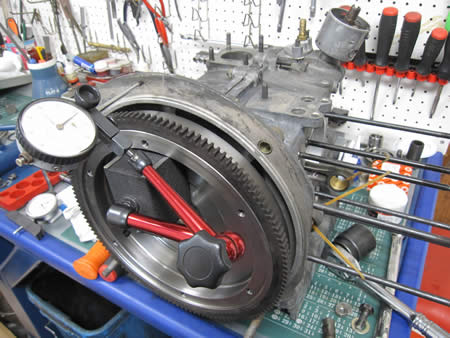 コンバータープレートからフライホイールにチェンジして、クランクシャフトのエンドプレイ調整を行っています。