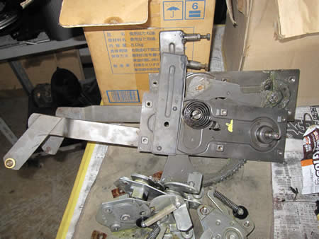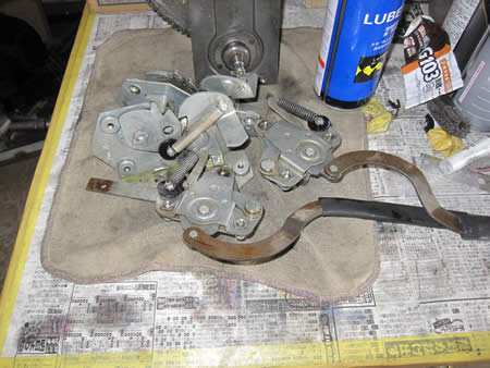 写真左はドアロックメカニズムで、写真中央はドアガラスのレギュレーターです。