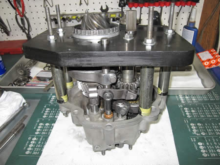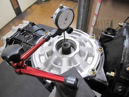 組み付けが完了したギアキャリアにフォークジグを組んで、各部の点検&クリアランス調整を行います。
