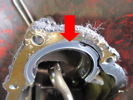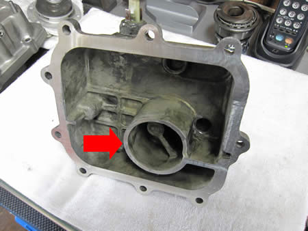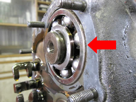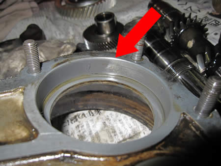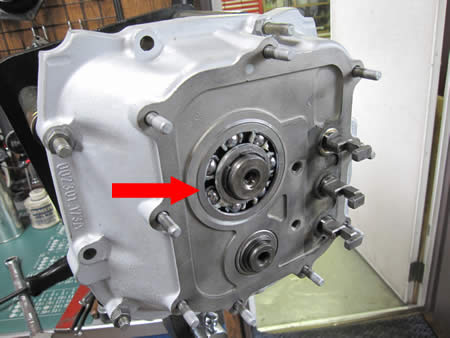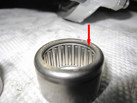 ケースに組み込まれているメインシャフトのニードルベアリング・・・インナーレースに変形があります。(写真赤矢印)