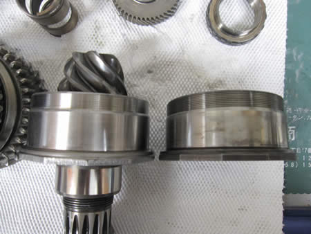 インプットシャフトを前後に動かすとカクカクと動いてします・・・写真右の矢印部は、動いていたベアリングにより摩耗したノーズコーンハウジング・・・産業廃棄物となりました。