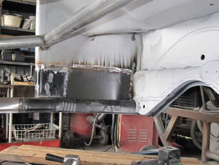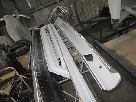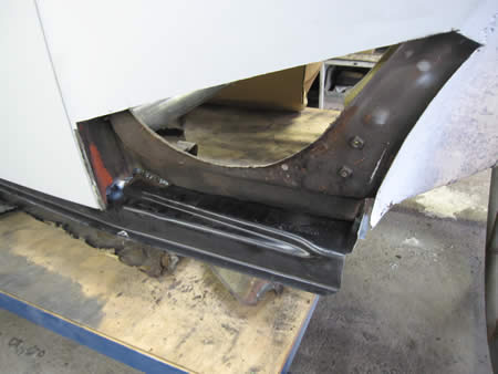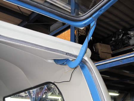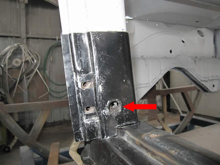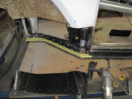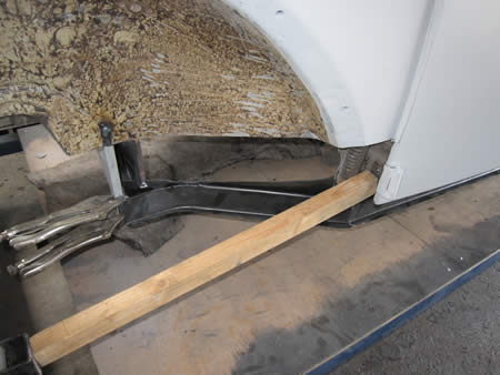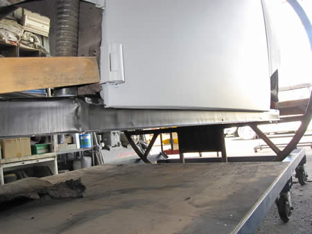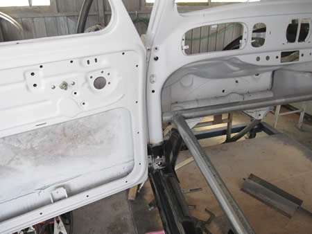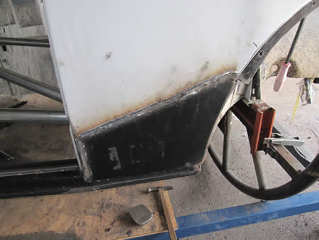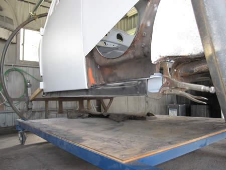 左サイドメンバーのアッパーパネルを仮付けして、ドアのチリなどを確認しています。