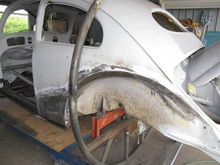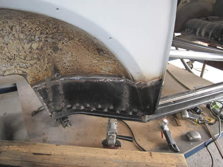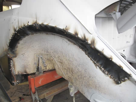 左クォーターパネルとリアフェンダーアーチも溶接部分を整えて面修正に掛かります!