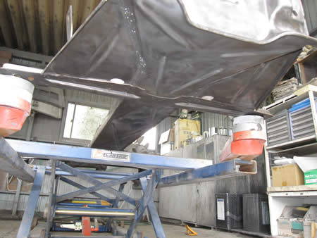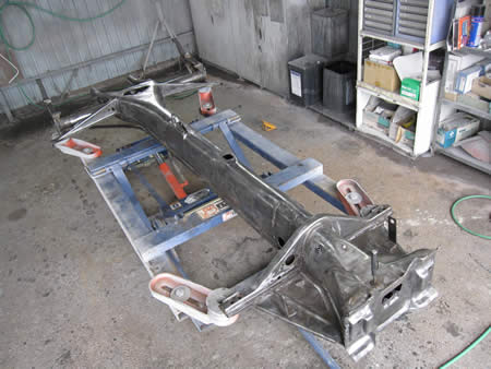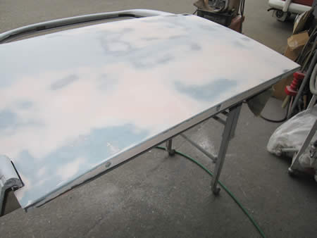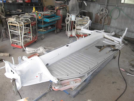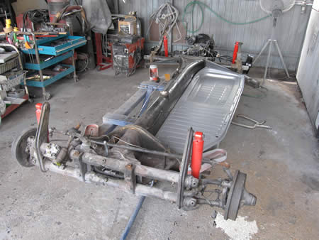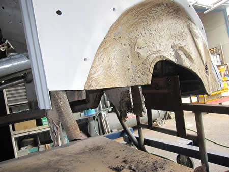 シャーシを裏返して、表面にベットリ塗られていたタールを削ぎ落とすのですが、昨日は猛暑・・・いつにないくらい大汗をかいていた板金屋・・・。