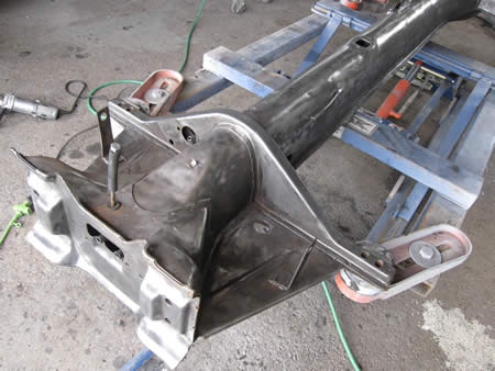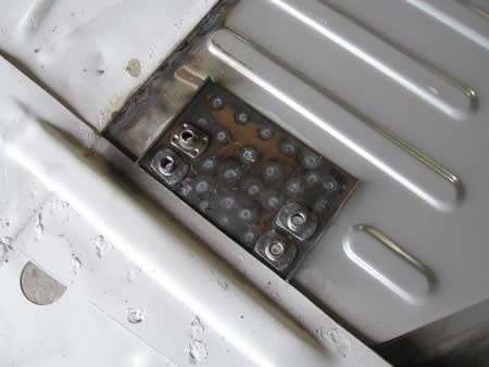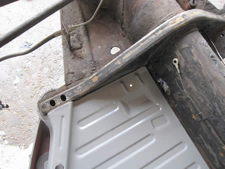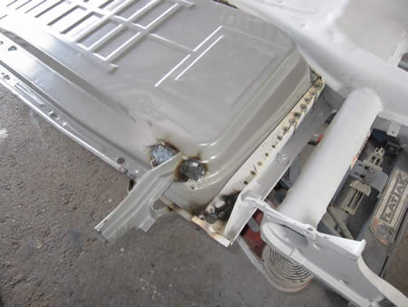 バグスポのスポット溶接機では、フロアーパンをまたぐだけのアームが無いため、この穴の部分をシャーシと溶接していきます。