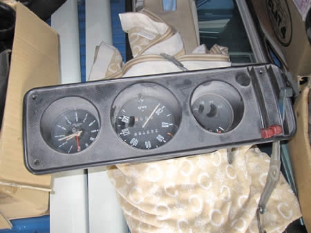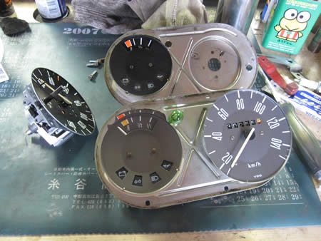 パーツカーより外したメーターと、現車のメーターをチェックしています。
