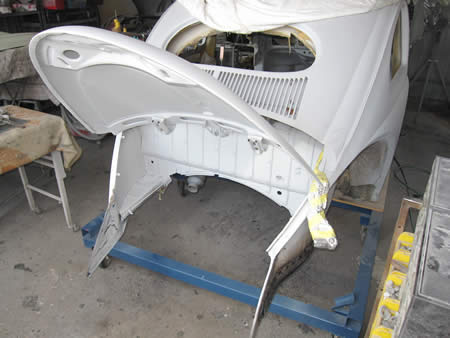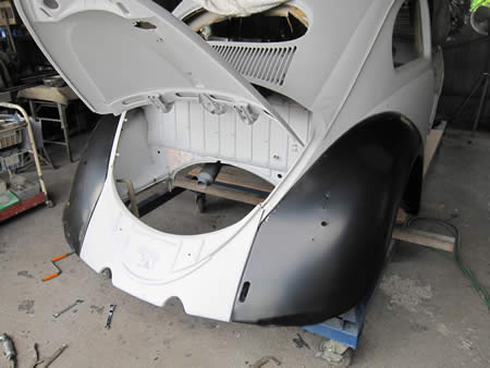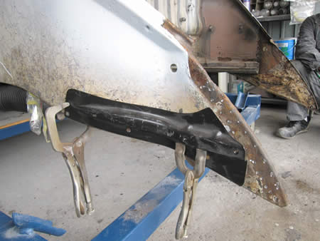 リアエプロン、リアフェンダーを仮付けして位置を確認しながら溶接の準備です。