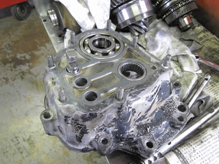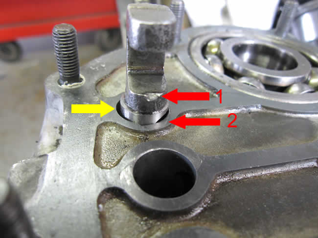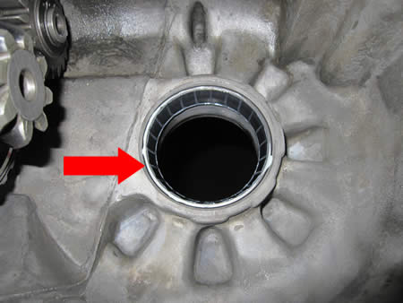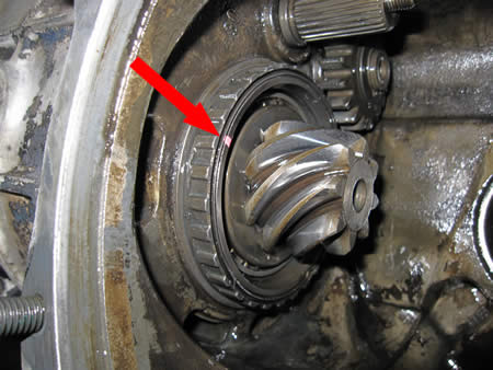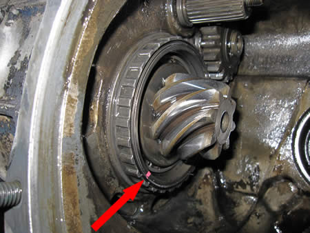 写真赤矢印の部分はベアリングレースで、ミッションケースの中で位置が固定?されているはずなんですが・・・。
