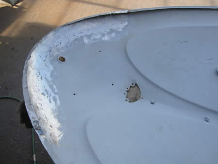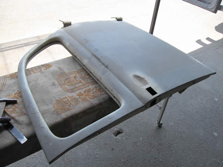 写真左はパーツ取り用に在庫していた純正リアフードから腐食が進んでいた下側のパネルを切り出しました。