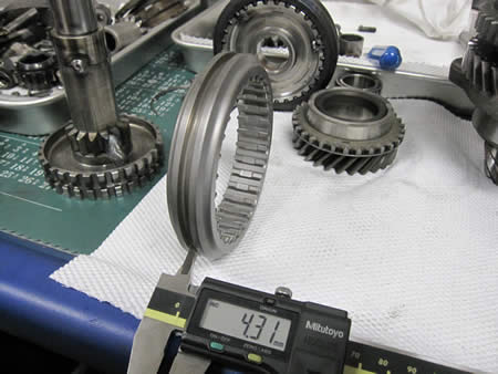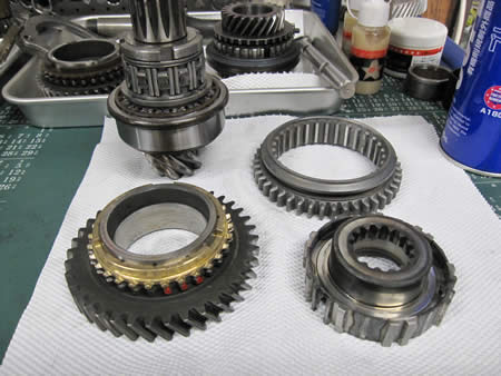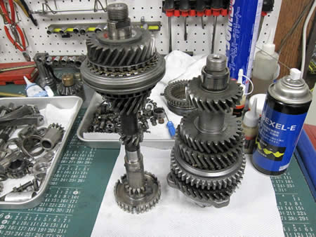 各ギア廻りのクリアランスを調整、シンクロリングは1〜4速まで交換して組み上がったメイン&ピニオンシャフト!