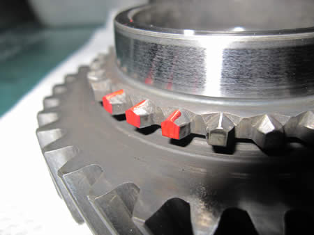 写真左はスライダーフォークの当たり面が摩耗した3−4速のスライダーリング。