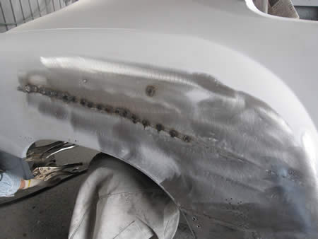 続いてサブマシンガンで撃ち抜かれていたフェンダーの穴を埋め、“しぼり”で面を整えています。